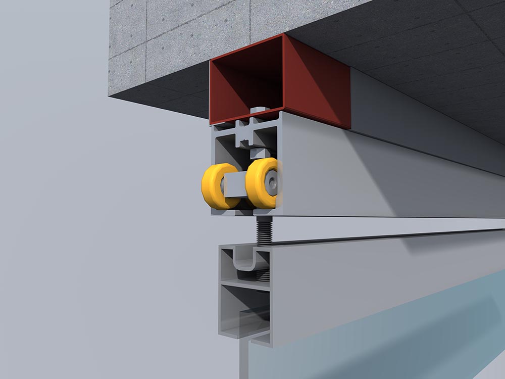 System components such as rails and rollers are made of high-strength aluminum. Since the guide rail is fixed on the ceiling, no guide rail is required on the floor. The wall modules are moved on the rail by rollers. The rail and roller system used is selected based on the weight/height of the panel and the parking area. A single roller can be used in systems with panel heights up to 500cm. For higher systems, double rollers are recommended. In addition, several rails can be arranged in the same location, rail axes can intersect, so the area can be easily divided for different uses.