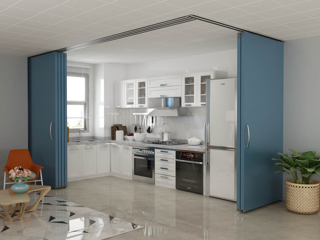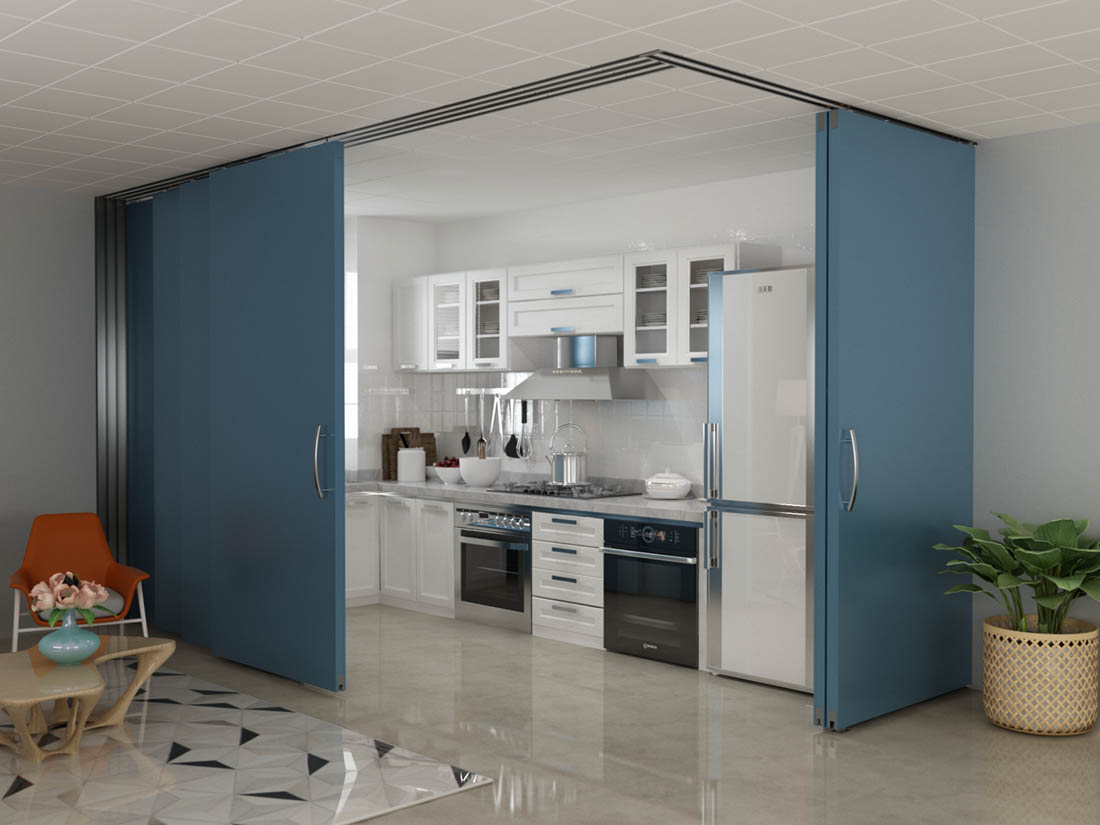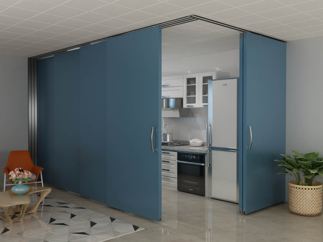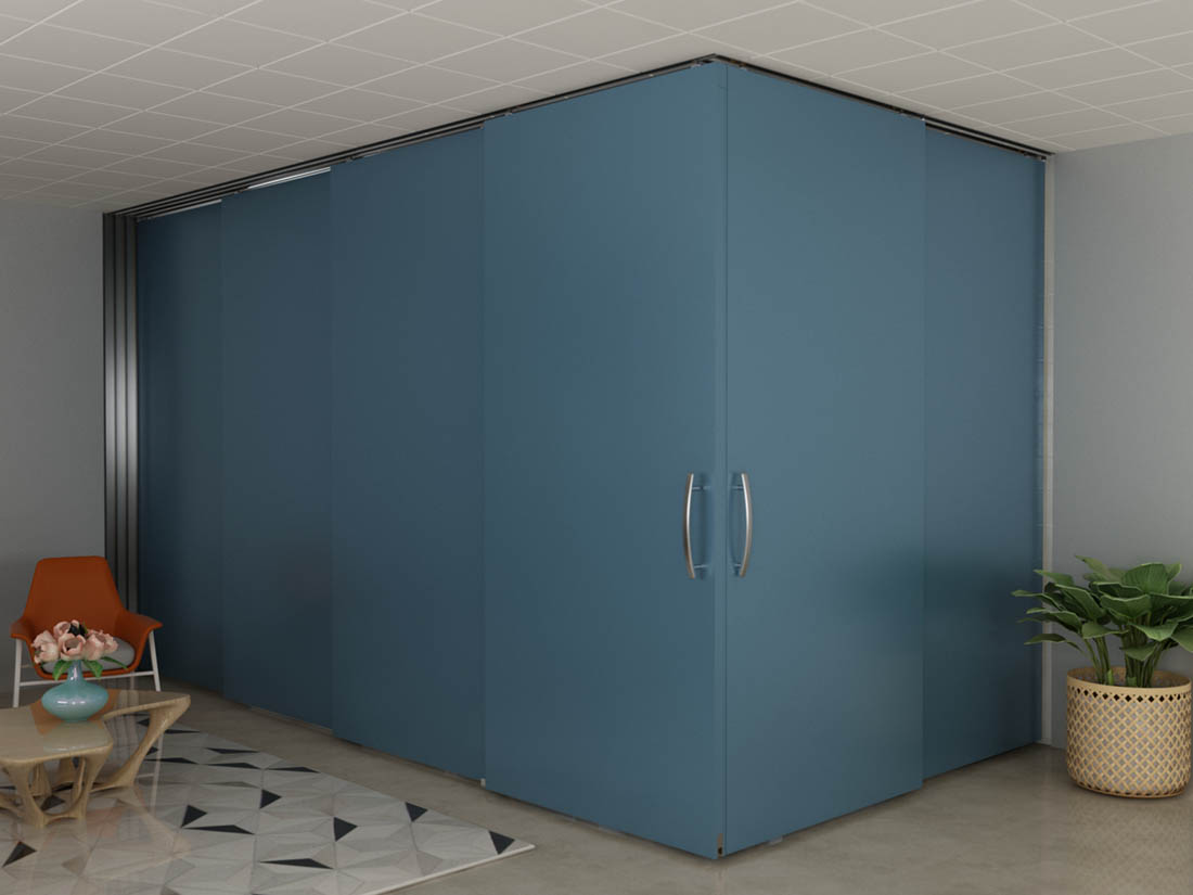When all panels come together side by side, they form a solid wall. Our sliding wall system allows you to create two distinct areas within the same space. Thanks to the telescopic guides that securely join the wooden panels together, creating a corner junction is extremely easy, allowing you to easily form an L-shaped secondary space. For transitions between spaces, the first or last panel can be configured to open or close. When needed, the system can be fully opened, and the wooden panels can be stacked unidirectionally or bidirectionally.