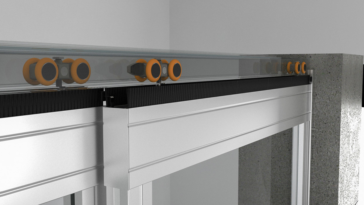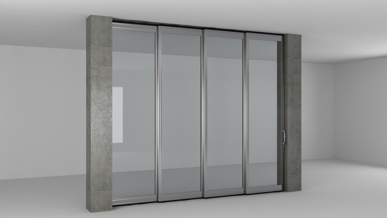 Panslide Glass Kayar Bölme Duvar Sistemi; eğilmeye karşı dayanıklı olarak dizayn edilmiş 40/50/60/80 mm kalınlıklarında ki alüminyum çerçevenin içine sabitlenen 6/8/10/12 mm kalınlığındaki temperli, ya da lamina temperli camlı modüllerin özel askı elemanları ve çok yönlü hareket edebilen makaralarla tavan kodunda yer alan alüminyum raya asılarak, birbirinden bağımsız olarak hareket ettiği ve belirli bir yerde saklanabilen panellerden oluşan bir sistemdir. Cam kayar sisteminde her bir modül bağımsız olmasına rağmen özel mekanizmalar sayesinde birbirlerini iter ve çekerler. Bu özellik kullanımda kolaylık sağlar.